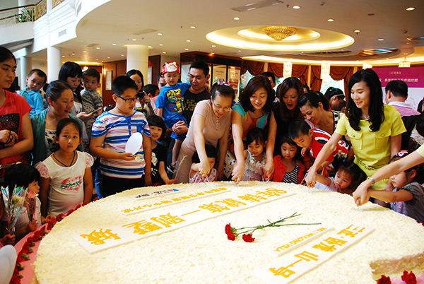 10時(shí)許,等待已久的時(shí)刻終于到了。“下面我們將邀請(qǐng)幾對(duì)母子一起來切蛋糕。”主持人的話音剛落,便有母親領(lǐng)著小孩舉手報(bào)名了,幾對(duì)母子一起切出“第一刀”。隨著這“第一刀”下去,蛋糕特有的香甜味便在營(yíng)銷中心內(nèi)彌漫開來,挑撥著人們的食欲。一邊等待的小朋友,饞得直咽口水;而拿到蛋糕的小朋友,則不顧形象地在媒體的鏡頭前大快朵頤,可愛的吃相令人捧腹。